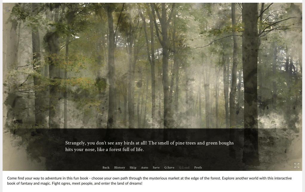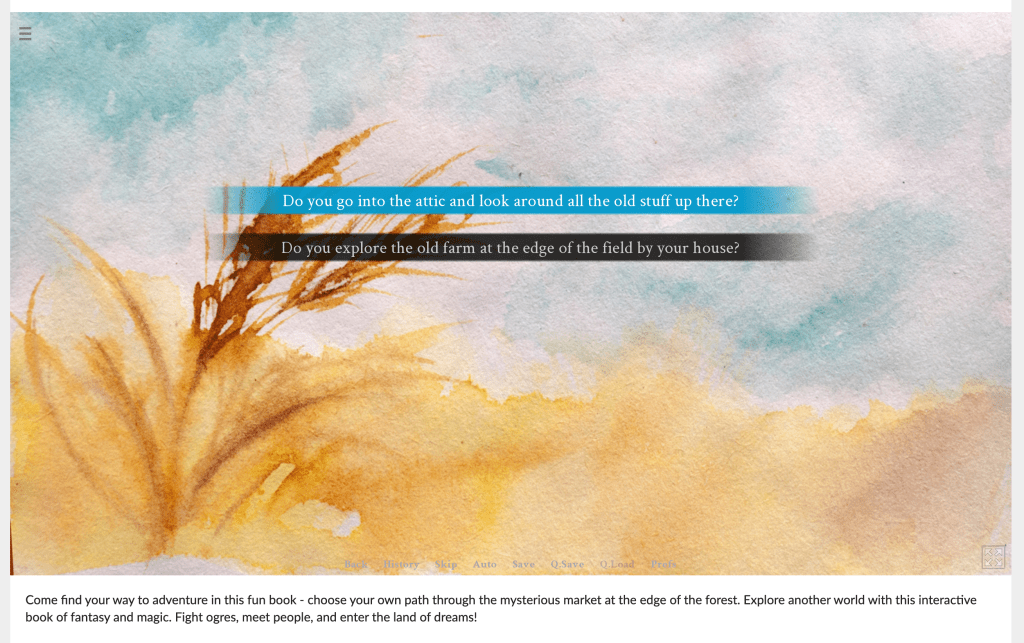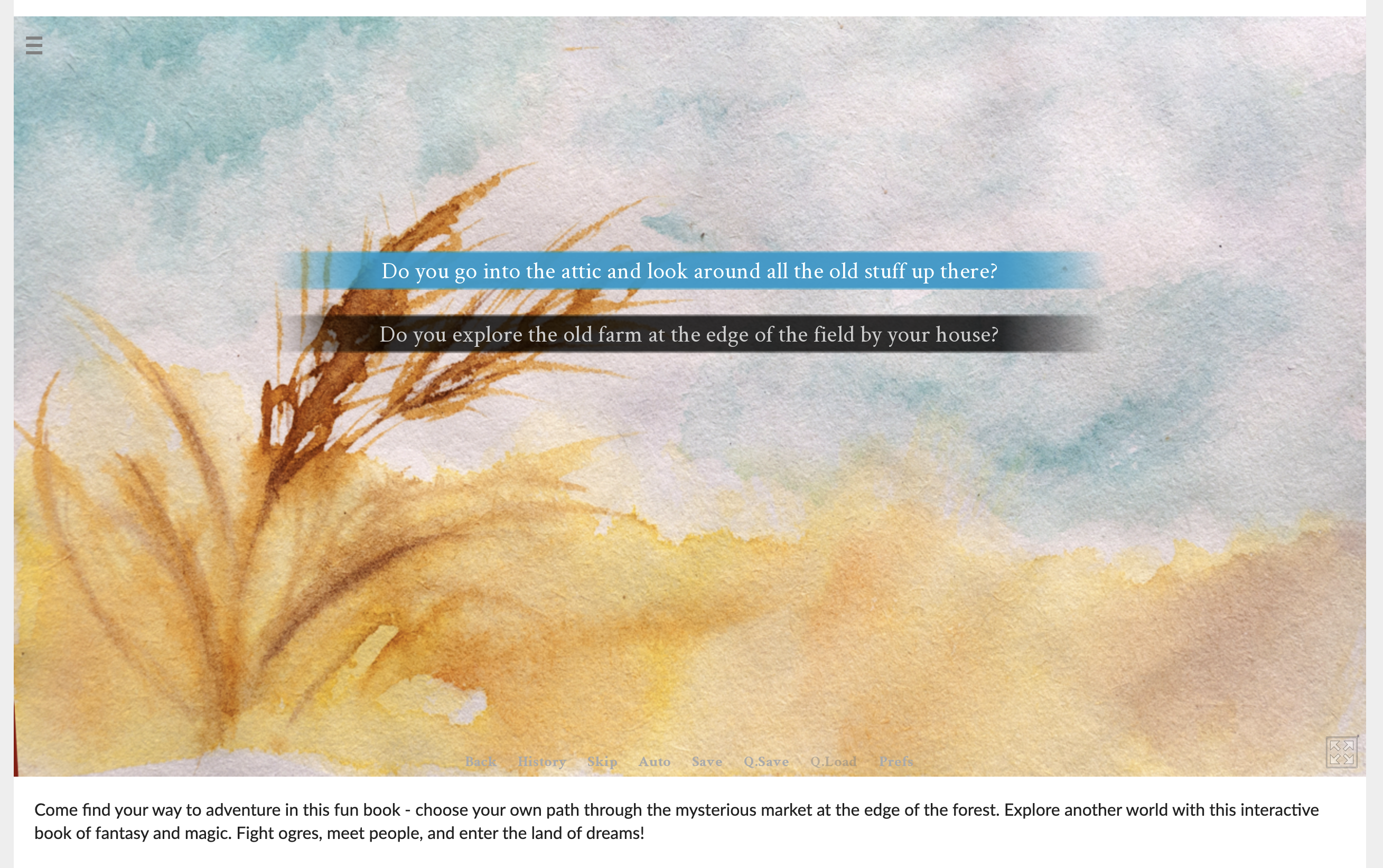 Come find your way to adventure in this choose your own adventure game – choose your path through the mysterious market at the edge of the forest. Explore another world with this interactive book of fantasy and magic. Fight ogres, meet travelers, and enter the land of dreams.